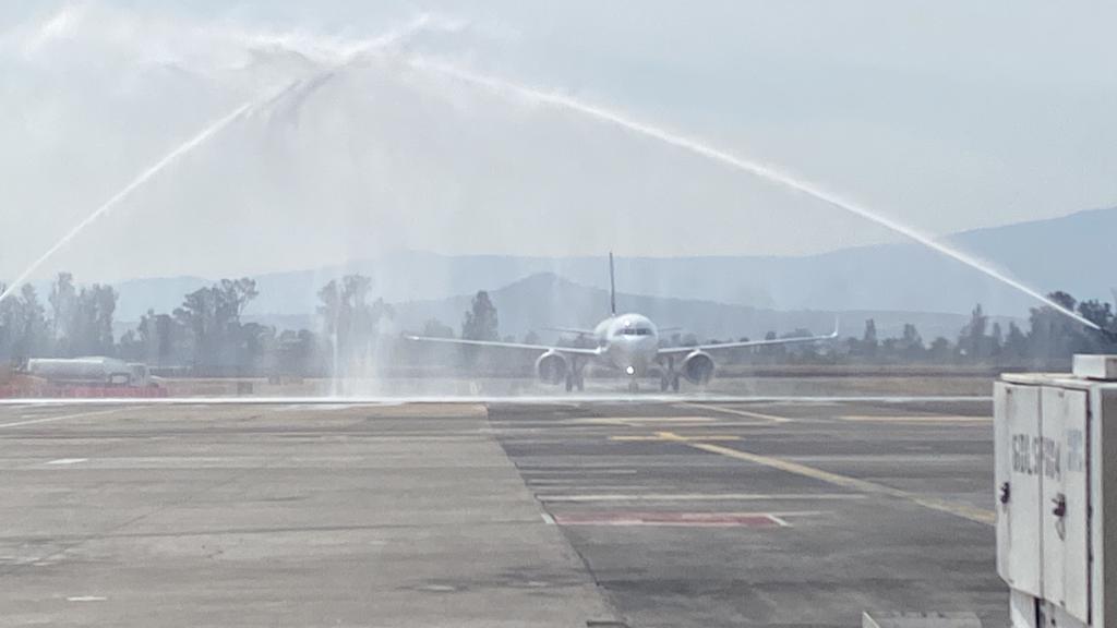 Al aterrizar, la aeronave fue recibida con el tradicional Arco de Agua.