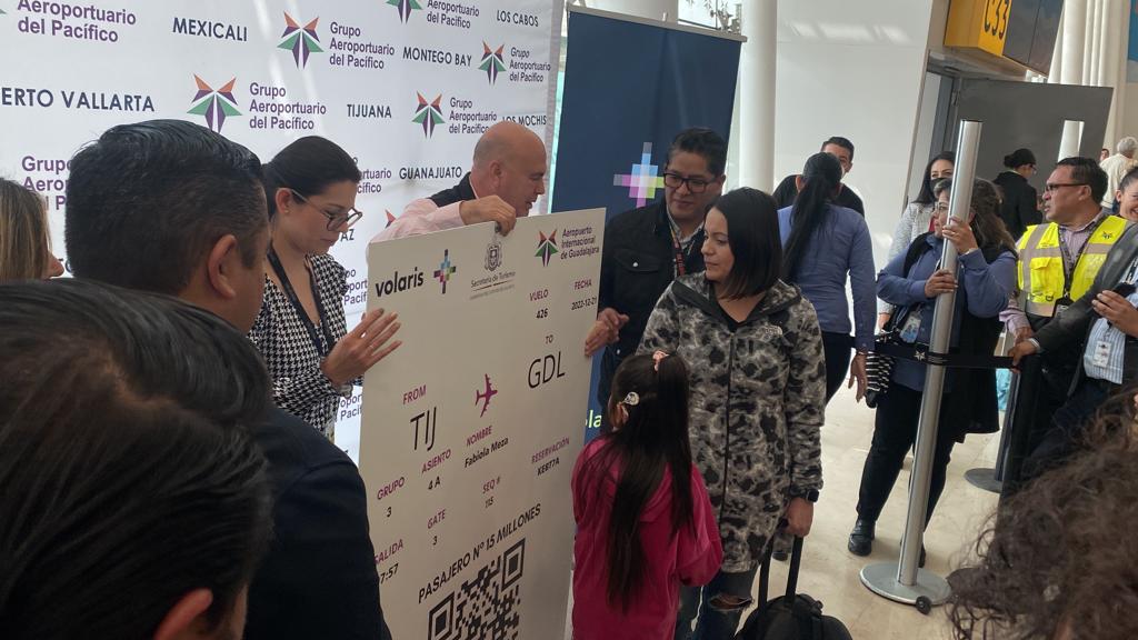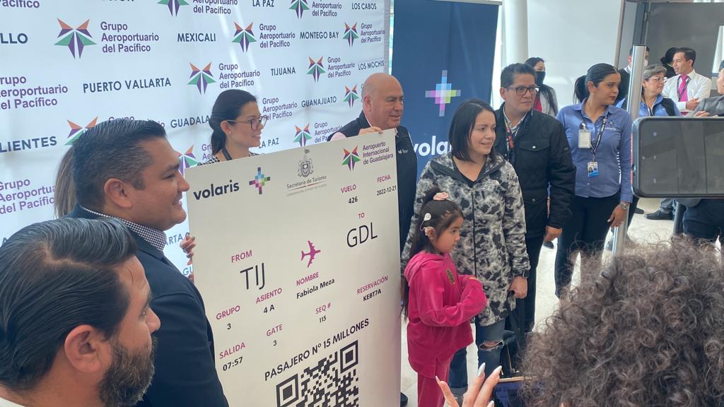 21 de Diciembre de 2022.- Fabiola Meza, usuaria de la aerolínea Volaris, procedente de Tijuana, se convirtió en la pasajera 15 millones, en el Aeropuerto Internacional de Guadalajara Miguel Hidalgo.