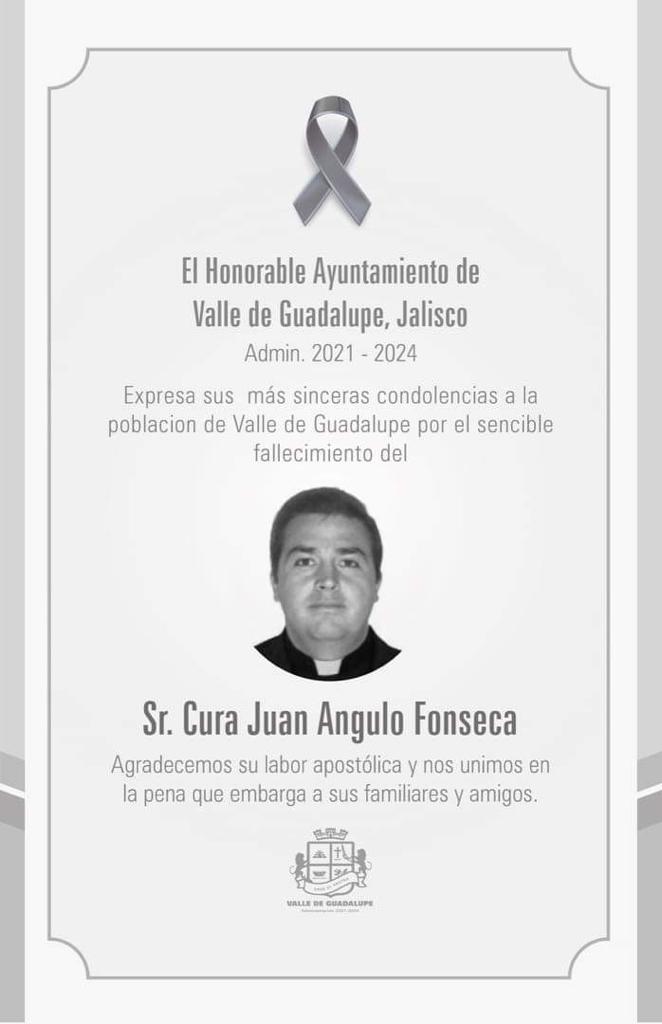 Así mismo, la Diócesis de San Juan de los Lagos manifestó sus condolencias por la muerte del sacerdote, “La Diócesis de San Juan de Los Lagos eleva súplicas a Dios, Padre de Misericordia ante el sensible fallecimiento del Sr. Pbro. Juan Angulo Fonseca”.