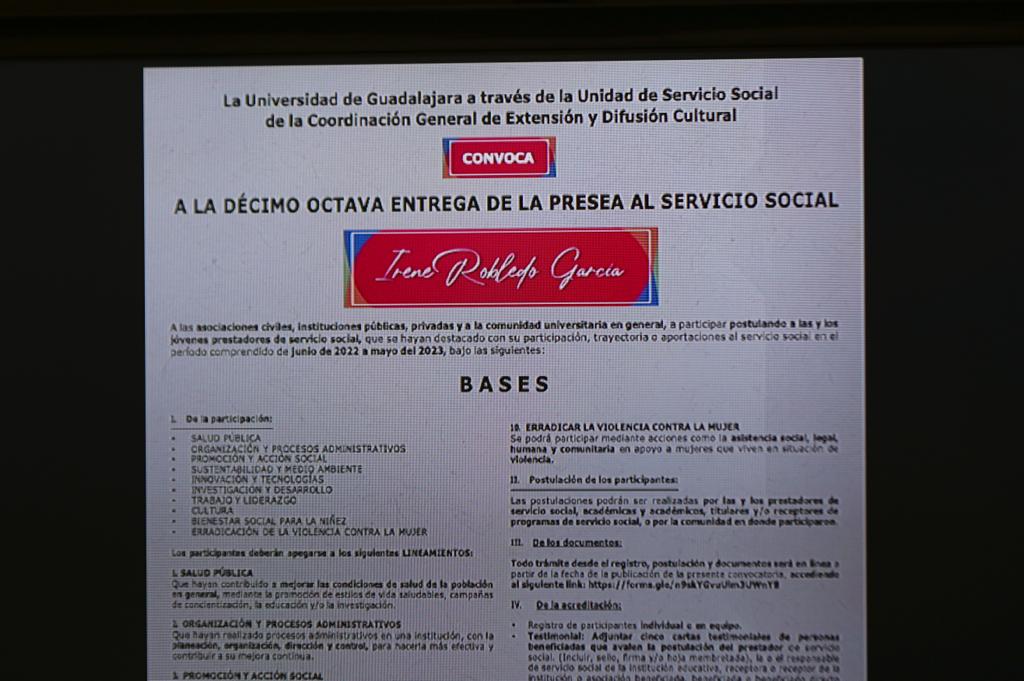 28 de Febrero de 2023.- La Universidad de Guadalajara (UdeG), mediante la Unidad de Servicio Social, de la Coordinación General de Extensión y Difusión Cultural, convoca a las asociaciones civiles, instituciones públicas, privadas y la comunidad universitaria a participar en la décimo octava edición de la entrega de la Presea al Servicio Social “Irene Robledo García”.