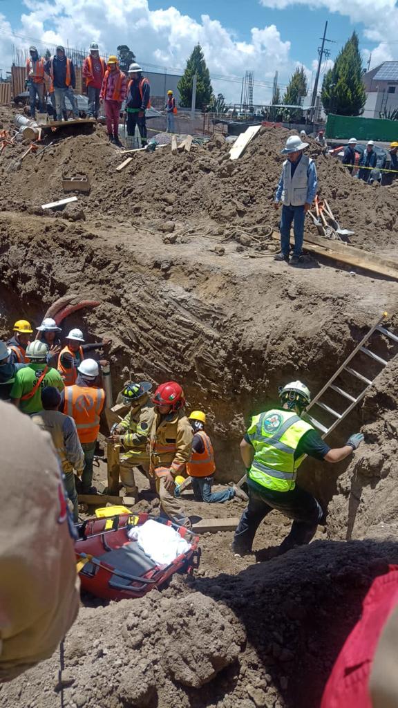 Rescatistas del SUEM y Cruz Roja realizan tareas para sacar a tres trabajadores de entre la tierra, los cuales se reportaron sin vida y los otros dos ya están en un hospital del Valle de Toluca