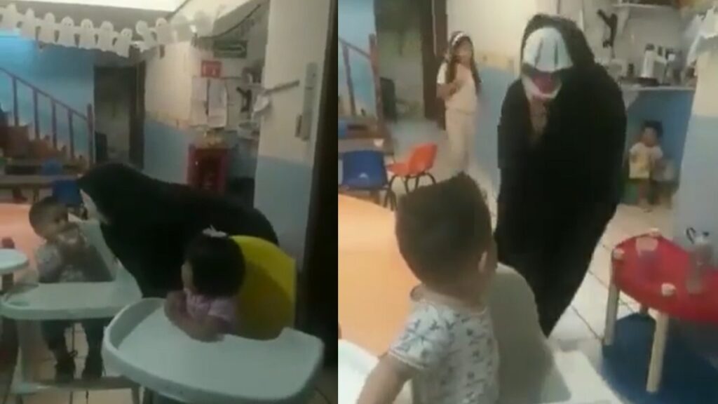 En el vídeo se aprecia a la persona disfrazada que asusta a los niños, y se ve a otras cuidadoras que a pesar del llanto de los niños, no interviene para frenar la acción.