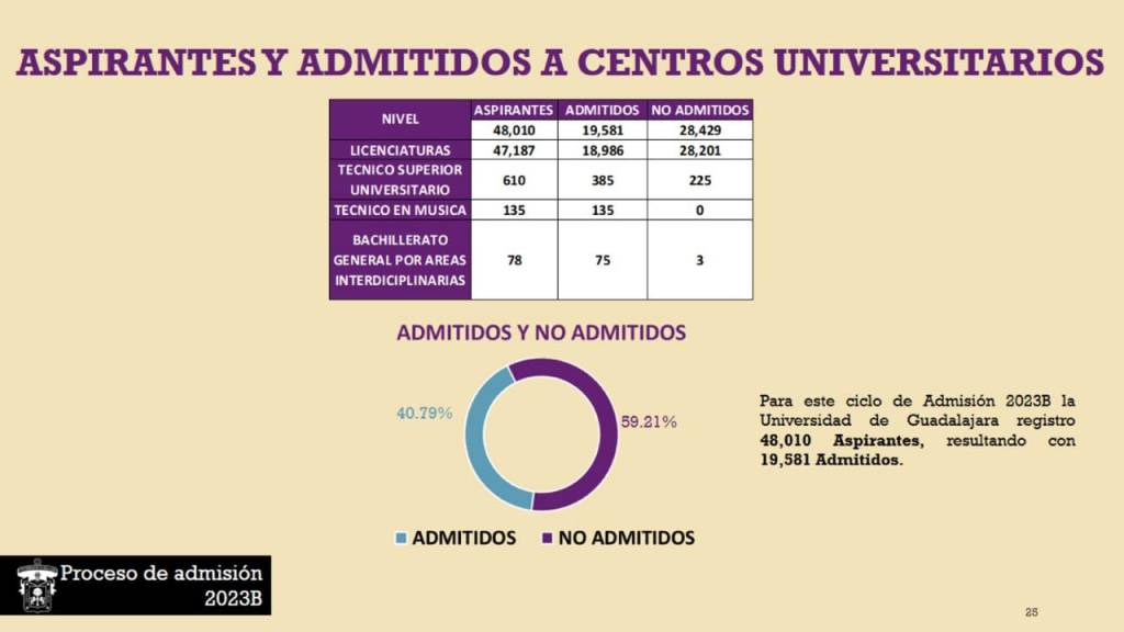 11 de Agosto de 2023.- La Universidad de Guadalajara publicó este día los dictámenes de admisión para el ciclo escolar 2023-B en centros universitarios, donde aceptó a 40.79 por ciento de sus aspirantes, que representan un total de 19 mil 581 nuevos alumnos en nivel superior. Esta cifra, en comparación con el calendario 2022-B, que admitió a 18 mil 831 aspirantes, representa un aumento de 750 nuevos espacios.