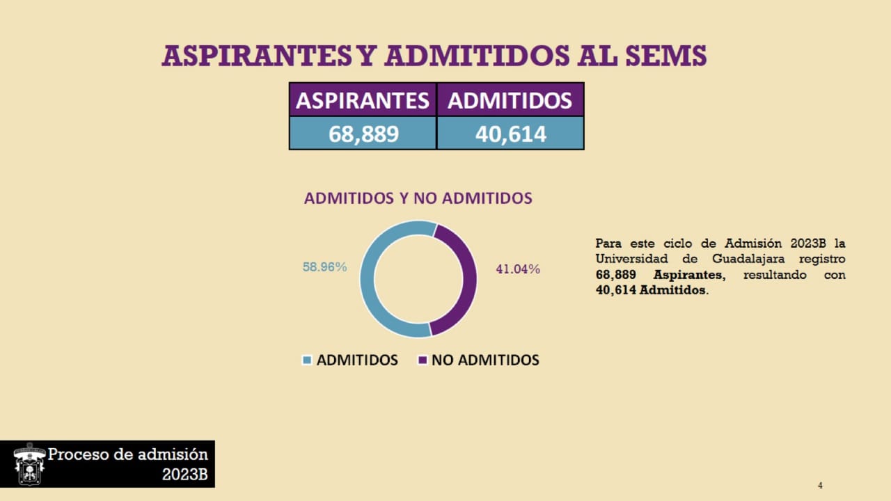Respecto al calendario 2024-A, el SEMS admitió a 75.07 por ciento de los aspirantes, es decir, a un total de 21 mil 202 alumnos que se sumarán a las preparatorias de la UdeG.