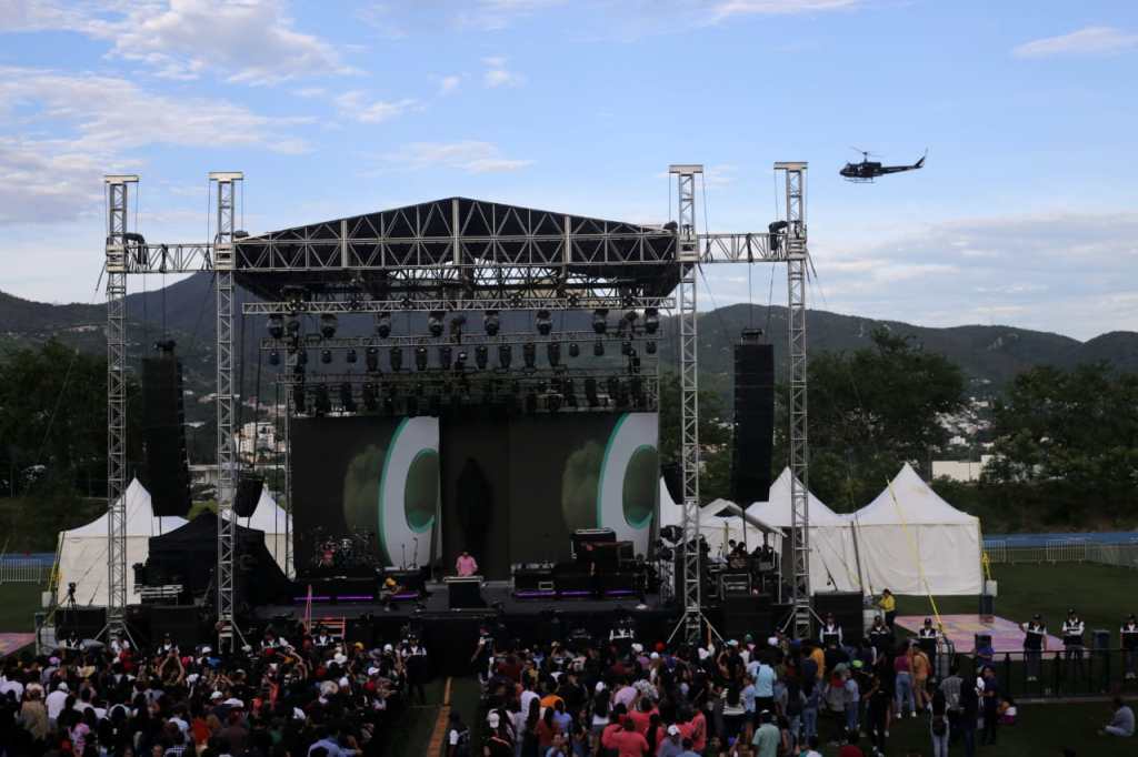 La cantante se presentó en las canchas del Polideportivo, ubicado a unos 50 metros de las instalaciones del Comité Directivo Estatal del PRI, donde horas antes de su presentación fueron localizados dos artefactos explosivos.