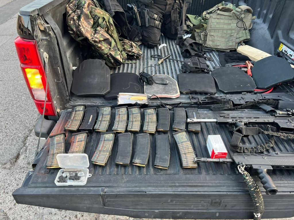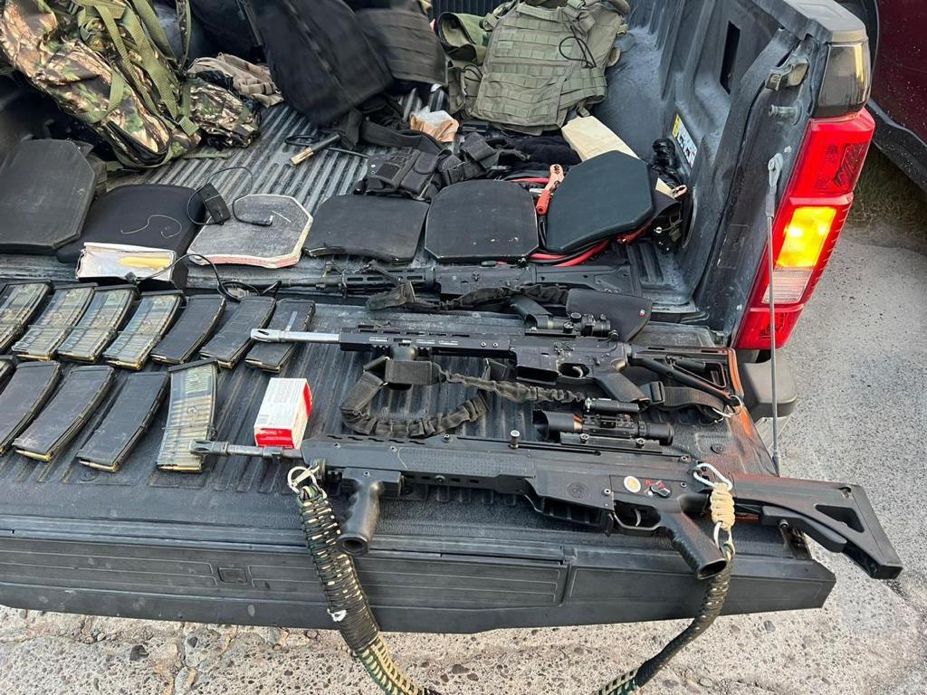Los elementos policiales revisaron la camioneta y localizaron tres armas de fuego largas y equipo táctico diverso.