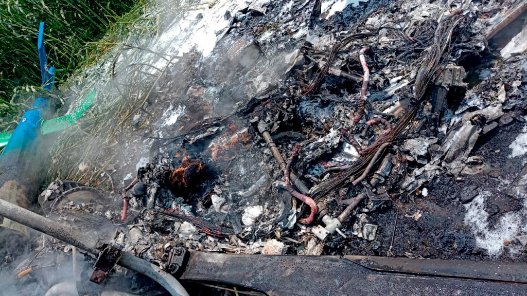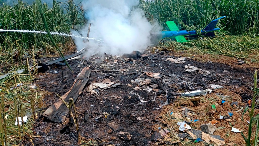 4 de Septiembre de 2023.-Un helicóptero se desplomó y se incendió en el municipio de Tuxpan, localidad ubicada en el sur de Jalisco, donde se registra un saldo de tres personas muertas.
