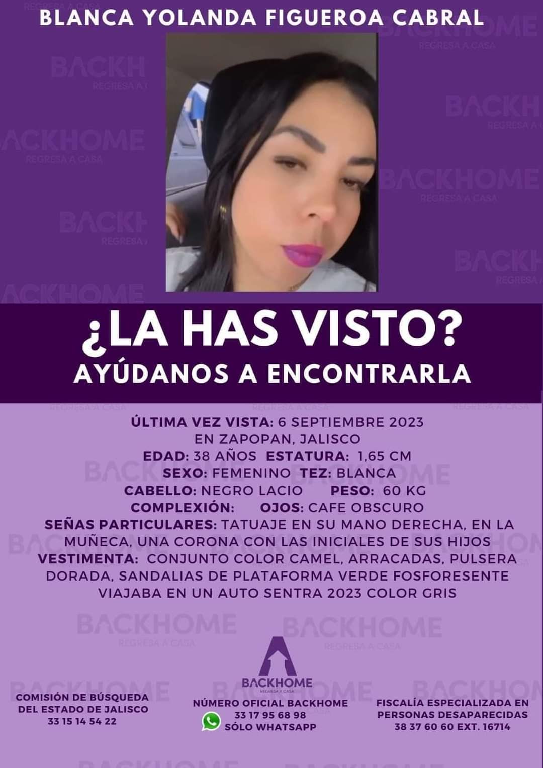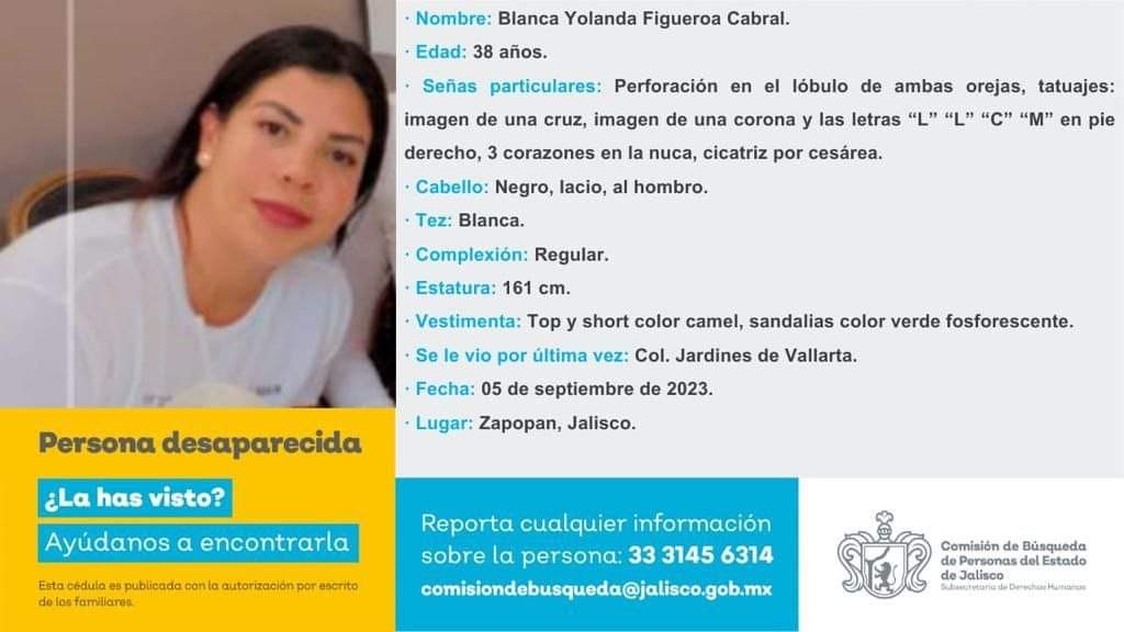 16 de Septiembre de 2023.- Familiares de Blanca Yolanda Figueroa Cabral, quien es administradora de una torre de departamentos de la zona de Puerta de Hierro, en Zapopan, se dicen desesperados por no saber nada de ella y temerosos de que algo les pueda pasar por emprender su búsqueda.
