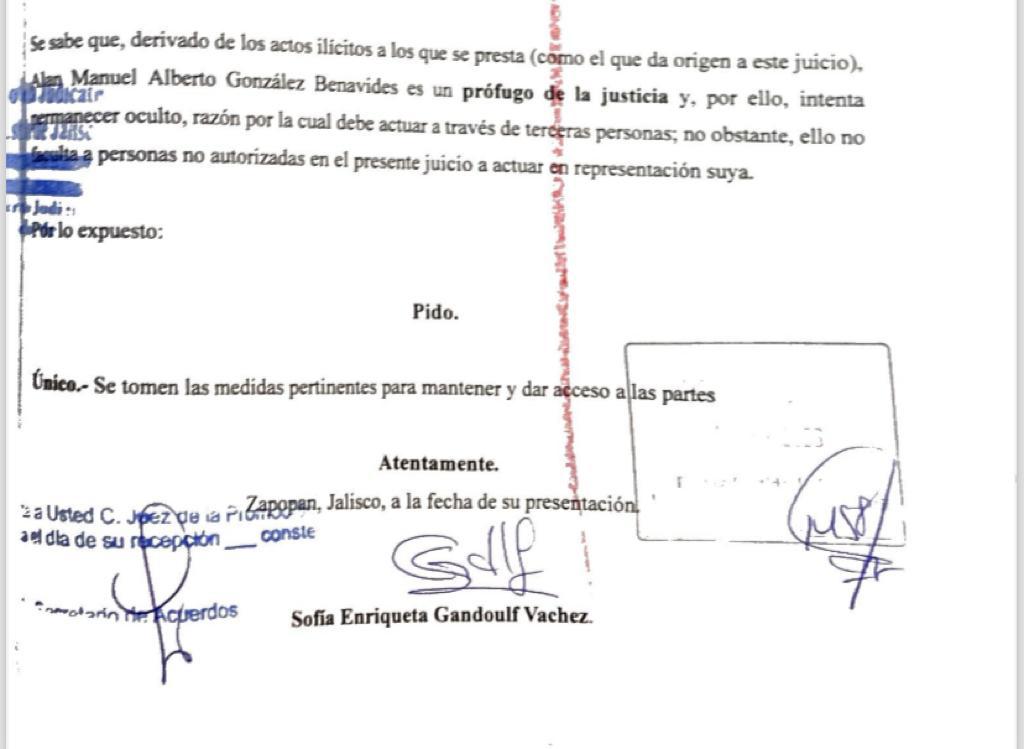 Se destaca a Sofía Enriqueta Gandoulf Vachez quien afirma que Alan Manuel Alberto González Benavides es un “prófugo de la justicia” e intenta permanecer oculto y así lo ha hecho del conocimiento a las autoridades judiciales en los juicios donde actúa.