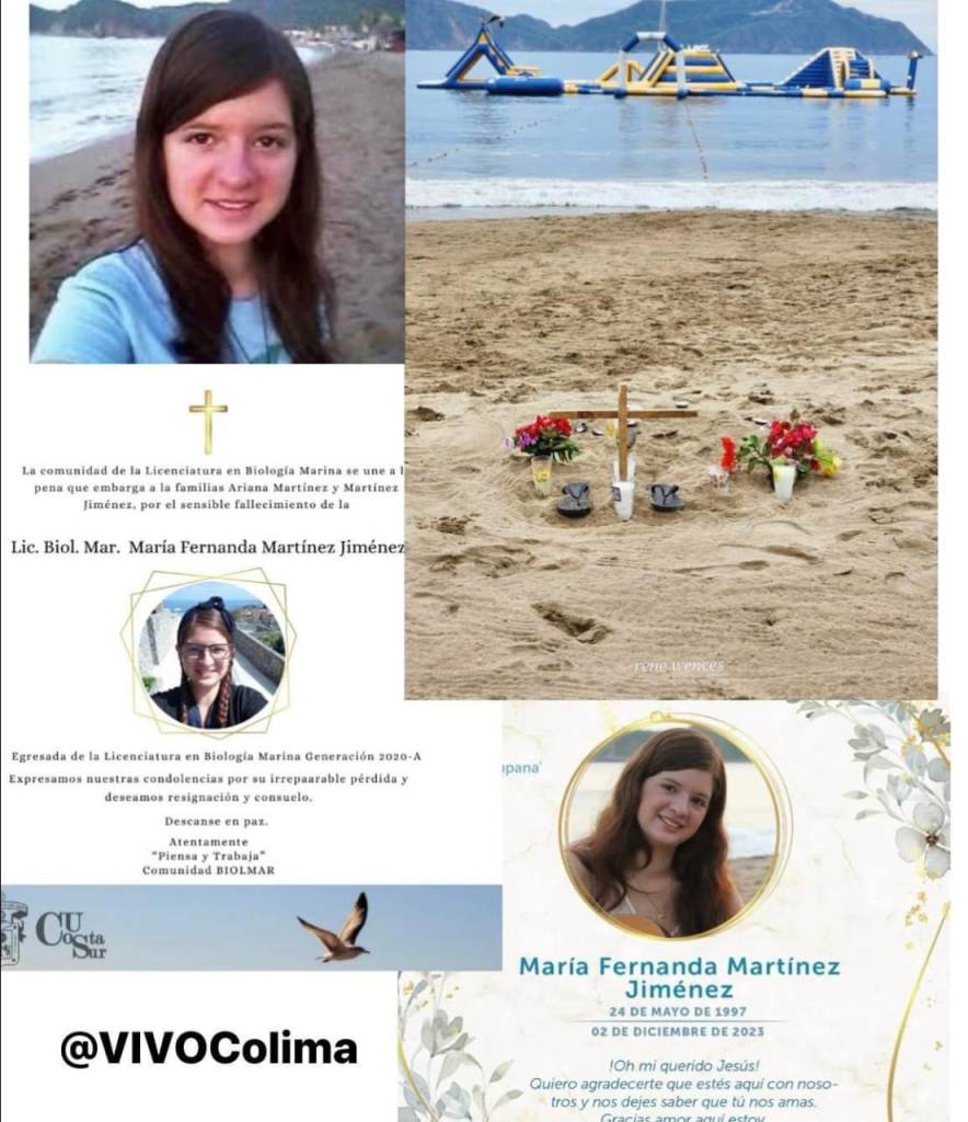 4 de Diciembre de 2023.- La víctima del ataque de un tiburón en playas de Cihuatlán Jalisco, fue identificada como María Fernanda Martínez Jiménez, era licenciada en Biología Marina, egresada del Centro Universitario de la Costa Sur, (CUCOSTA), y el centro de estudios que lamentó su muerte en un mensaje desde sus redes sociales.