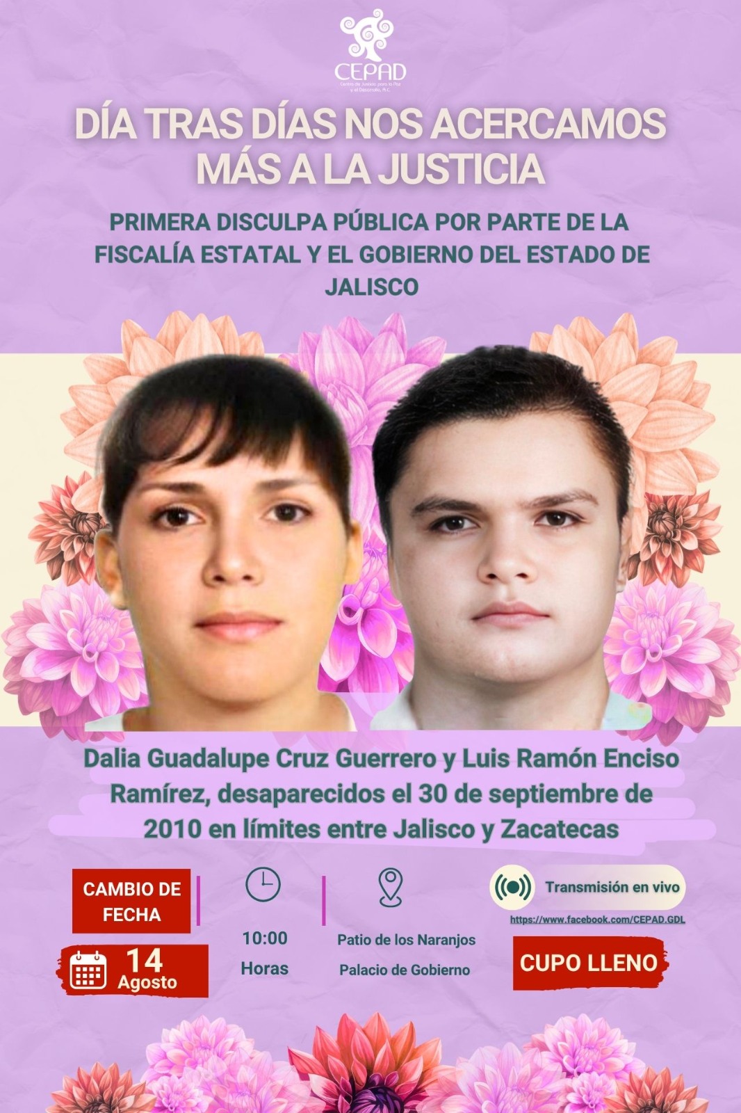 La disculpa estuvo dirigida a los familiares de Dalia Guadalupe Cruz Guerrero, Luis Ramón Enciso Ramírez, y Bernardo N, y Carolina N, quienes desaparecieron el 30 de septiembre de 2010 en los límites entre Jalisco y Zacatecas, y se hace público un compromiso de la Fiscalía Estatal, expone el titular de la dependencia, Salvador González de los Santos, “el caso de estas cuatro personas desaparecidas en diciembre del 2010 nos recuerda la importancia de fortalecer permanentemente las acciones de investigación, prevención, y coordinación, con otras autoridades, seguiremos trabajando por determinación para que hechos tan lamentables no se repitan”.