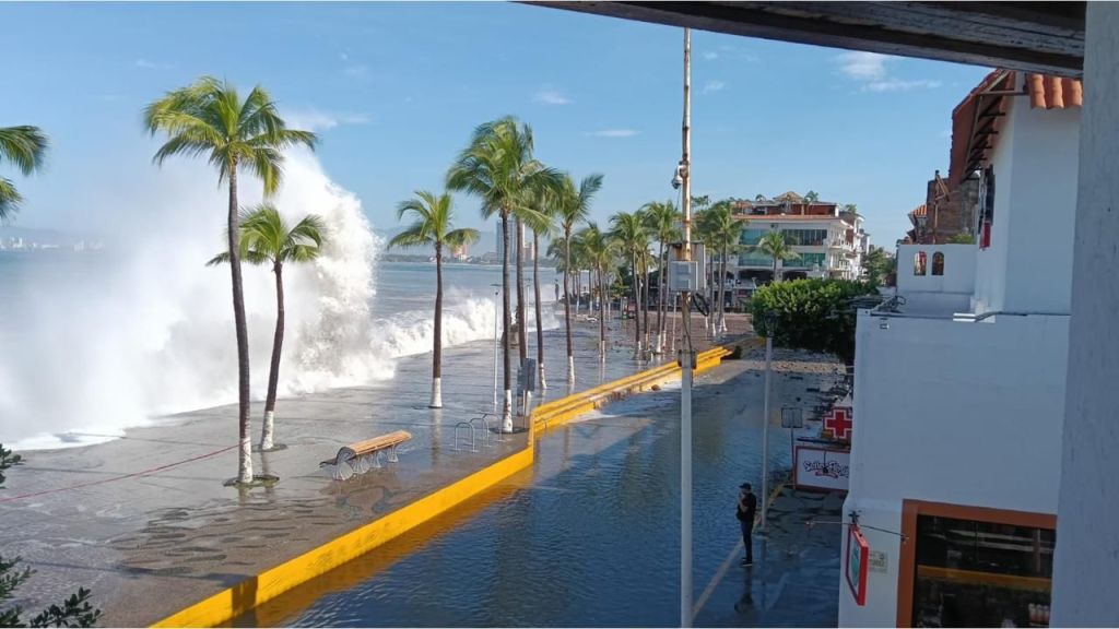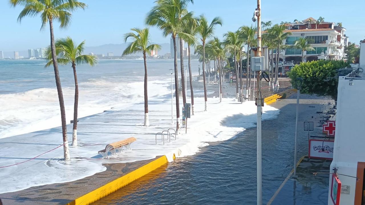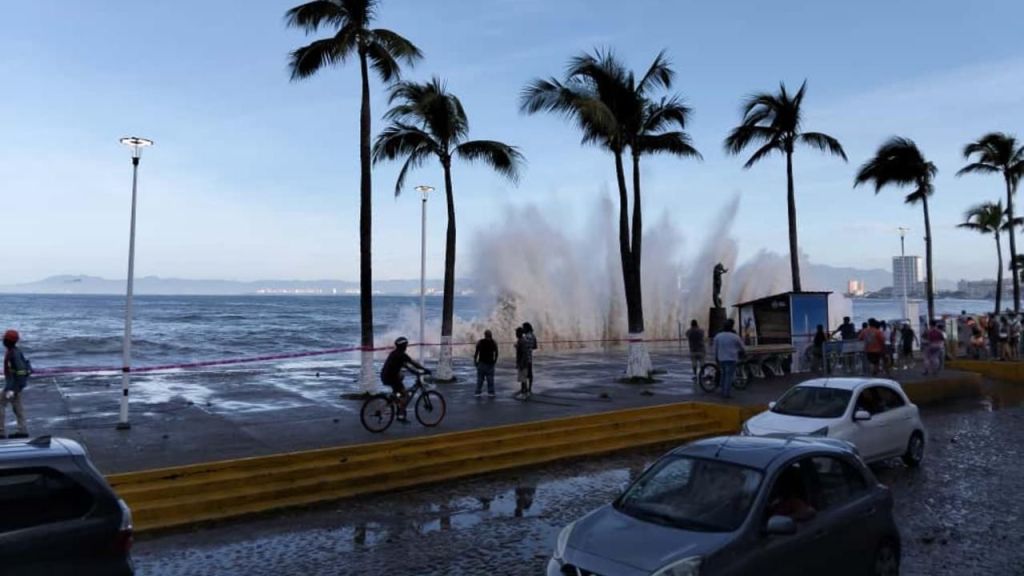“en Puerto Vallarta tenemos marea de tormenta, prácticamente desde la zona de Lapi, donde llegan los cruceros, hasta el Malecón de Puerto Vallarta; tenemos inundaciones desde la franja de playa hasta la avenida Medina Ascencio. Hay afectaciones a comercios y a vehículos, no tenemos personas lesionadas”.