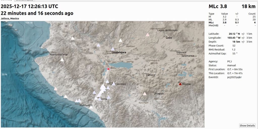 17 de Diciembre de 2025.- La Unidad Estatal de Protección Civil y Bomberos Jalisco, (UEPECJAL), informa de la incidencia de seis sismos registrados en las últimas horas, al sur del Área Metropolitana de Guadalajara, y se percibieron principalmente en los municipios de Teocuitatlán de Corona y Zacoalco de Torres.