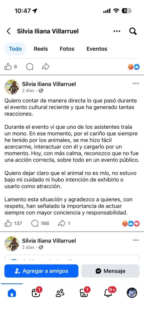 En su perfil de Facebook, la regidora publicó un mensaje en el que describe: “durante el evento vi que uno de los asistentes traía un mono. En ese momento, por el cariño que siempre he tenido por los animales, se me hizo fácil acercarme, interactuar con él y cargarlo por un momento. Hoy, con más calma, reconozco que no fue una acción correcta, sobre todo en un evento público.”